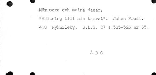 //// Mar-is or g och mulna dagar, //// "Hälsning till min kamrat". Johan Frost. //// 4:8 Nykarleby. S.L.S. 37 s.525-526 nr 65. //// ÅBO ////