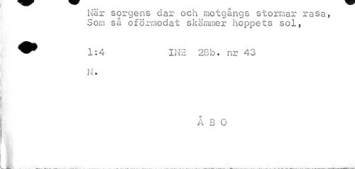 //// När sorgens dar och motgångs stormar rasa, Som så oförmodat skämmer hoppets sol, //// 1:4 INE 28b. nr 43 //// N. //// ÅBO ////
