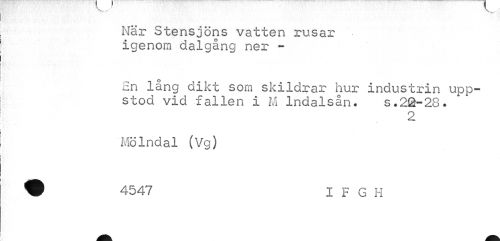 //// När Stensjöns vatten rusar igenom dalgång ner - //// £n lång dikt som skildrar hur industrin uppstod vid fallen i M Indalsån. s.2&~28. //// 2 //// Mölndal (Vg) • 4547 I F G H ////