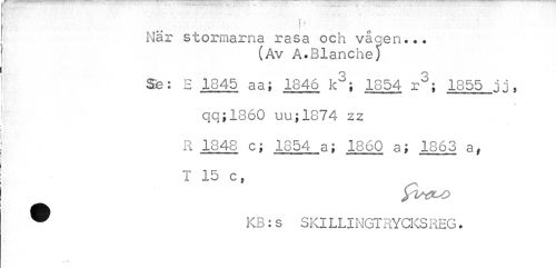 //// När stormarna rasa och våcen... //// (Av A.BlancheJ //// Se: E 1645 aa; 1846 k^; 1854 r3; 1855 jj, //// qq;1360 uu;1874 zz //// R 1848 c; 1854 a; 1860 a; 1863 a, T 15 c, //// KB:s SKILLINGTRYCKSREG. ////