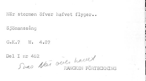 //// I //// I //// När stormen öfver hafvet flyger». //// Sjömanssång j //// G.K.? W. 4.8? f //// i //// ¦ //// Del I nr 462 / //// I M / i. f .X //// P A/fa4 ¦ s //// J 'f RANCKEN FÖRTECKNING ////