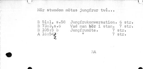 //// ^—- v.--„•¦¦ //// När stundom mötas jungfrur två... //// » //// B 51:1, s.58 Jungfrukonversation. 6 str. B 73:3,s.6 Vad man bör i stan. 7,str. B 105:5 b Jungfrumöte. 7 str. //// A 16:542' « 7 str. //// t //// ( //// • RA //// ; ////