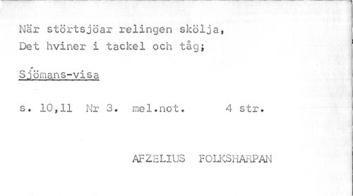 //// När störtsjöar relingen skölja, Det hviner i tackel och tåg; //// Sjömans-visa //// s. 10,11 Nr 3. mel.not. 4 str. //// AFZELIUS FOLKSHARPAN ////