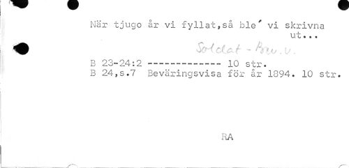 //// När tjugo år vi fyllat,så ble' vi skrivna //// ut... //// { c(.i h lo . 'J , //// B 23-24:2 ... 10 str. //// B 24,s.7 Beväringsvisa för år 1094. 10 str. //// RA ////