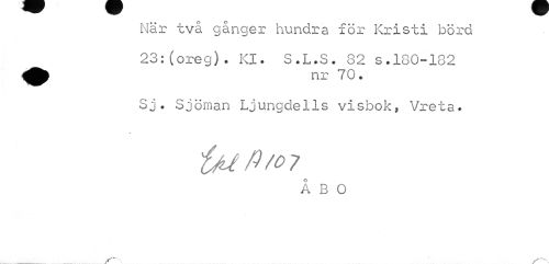 //// När två gånger hundra för Kristi börd ^ 23:(oreg). Kl. S.L.S. 82 s.180-182 //// Sj. Sjöman Ljungdells visbok, Vreta. //// iMft/07 //// ÅBO //// jf \ V\ ////