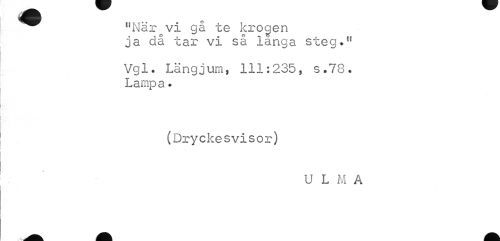 //// "När^vi gå te krogen //// ja då tar vi så langa steg." //// Vgl. Längjum, 111:235, s.78. Lampa. //// (Dryckesvisor) //// U L M A ////