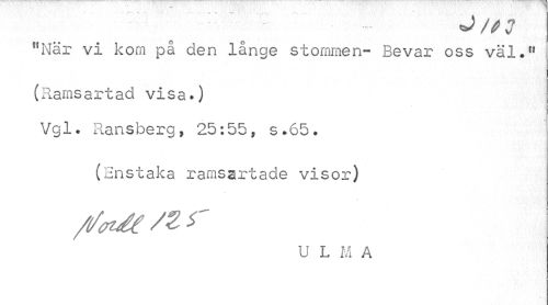 //// :: J/n //// "När vi kom på den långe stommen- Bevar oss väl." //// (Ramsartad visa.) Vgl. Ransberg, 25:55, s.65. //// (Enstaka ramsartade visor) //// U L M A ////