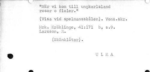 //// ffMar vi kom till ungkarlsland rosor o fioler." //// (Visa vid spelmansskålen). Vons.skr. //// Nrk. Kräklinge, 41:171 b, s.9. Larsson, //// (Skänklåtar). //// • U L m A ////