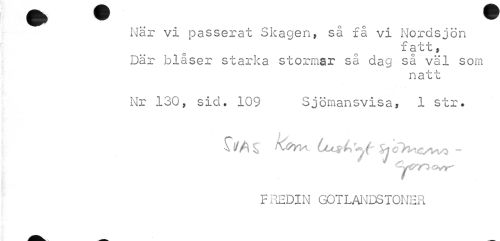 //// När vi passerat Skagen, så få vi Nordsjön //// fatt, //// Där blåser starka stormar så dag så väl som //// natt //// Nr 130, sid. 109 Sjömansvisa, 1 str. //// i //// chsr* //// F HEDIN GOTLANDSTONER ////