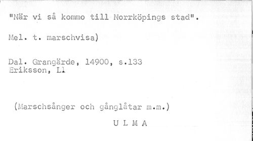 //// "När vi så kommo till Norrköpings stad". //// Mel» t. marschvisa) //// Dal? Grangärde, 14900, s.133 Eriksson, LI //// (Marschsånger och gånglåtar m.nu) //// U L M A ////
