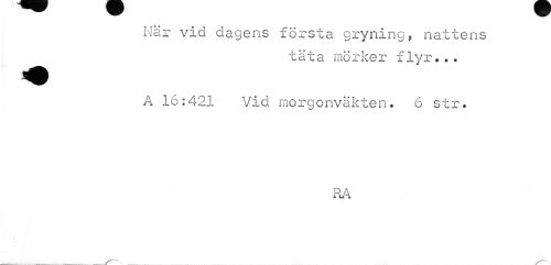 //// När vid dagens första gryning, nattens //// täta mörker flyr... //// A 16:421 Vid morgonväkten. 6 str. //// RA ////