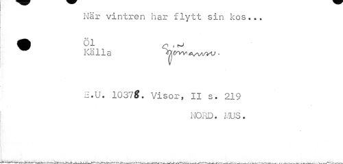 //// När vintren har flytt sin kos... //// • " n //// 01 o > //// Källa ^evvuv/wvu • //// E.U. 1037^. Visor, II s. 219 //// NORD. MUS. ////