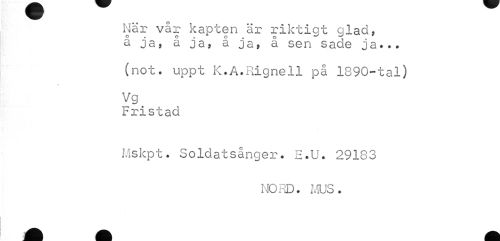 //// När vår kapten är riktigt glad, å ja, å ja, å ja, å sen sade ja... //// (not. uppt K.A.Pdgnell på 1890-tal) Vg //// Fristad //// Mskpt. Soldatsånger. H.U. 29183 //// NORD. MUS. ////