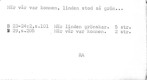 //// När vår var kommen, linden stod så grön... //// i //// B 23-24:2,s.101 När linden grönskar. 5 str. 1 29,s.205 När vår var kommen. 2 str. //// i //// i //// RA i //// I //// I ////