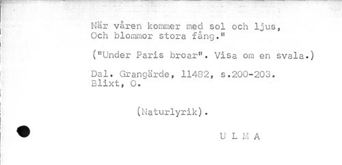 //// t //// • •• //// När våren kommer med sol och ljus, Och blommor stora fång.11 //// (llUnaer Paris broar11. Visa om en svala.) //// Dal. Grangärde, 11482, s.200-203. Blixt, O. //// (Naturlyrik). ////