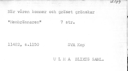 //// - • "* * ' *•- . i . * v //// När våren kommer och gräset grönskar //// ¦ //// i //// "Hembrännaren" 7 str. //// 11482, s.1150 SVA Kop //// t M //// U L M A BLIXTS SAML. j ////