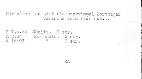 //// I ¦ //// När våren med sitt blomstervimmel Bortjagar //// vinterns köld från oss... //// i //// i //// ¦ //// B 7,s.68 Sheits. 3 str. ! //// A 2:24 Normandie. 3 str. I //// A 16:93 11 3 str. //// I //// i //// ¦ //// RA ////