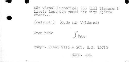 //// När vårsol 1 uppstiger upp till firmament Livets lust och vemod har mitt hjärta ^^ bränt •.. //// (mel.not.) (0,du min Valdemar) //// # //// Utan prov (' //// J //// Mskpt. Visor VIII.s.205. E.U. 32072 //// NORD. MUS. ////