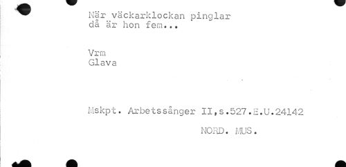 //// ¦ B //// ^ När väckarklockan pinglar //// då är hon fem... //// Vrrn Glava //// % //// Mskpt. Arbetssånger II,s.527.E.U.24142 //// NORD. MUS. ////