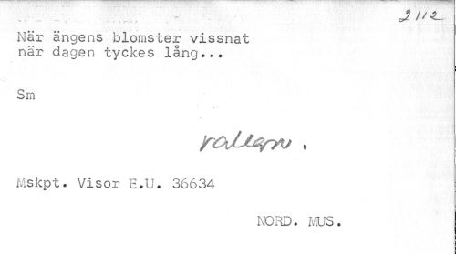 //// JU-Z.. //// När ängens blomster vissnat när dagen tyckes lång... //// j //// Sm //// Mskpt. Visor E.U. 36634 //// NORD. ms. ////