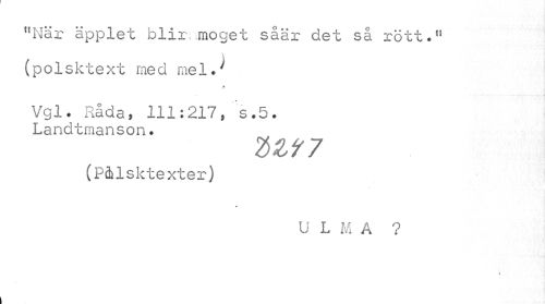 //// !fNär äpplet blirnmoget såär det så rött*" (polsktext med mel.^ //// Vgl. Råda, 111:217, s.5. Landtmanson. //// 25 M7 //// (Pchlsktexter) //// / //// U L M A ? //// * ////