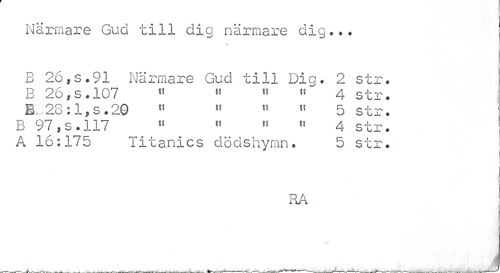//// Närmare Gud till dig närmare dig... //// B 26,s.91 Närmare Gud till Dig. 2 str. B 26,s.107 " " « "" 4 str. B.,28: l,s .20 " « " « 5 str. B 97,s. 117 « « « 4 str. ; //// A 16:175 Titanics dödshymn. 5 str. I //// •1 //// RA //// ...J ////