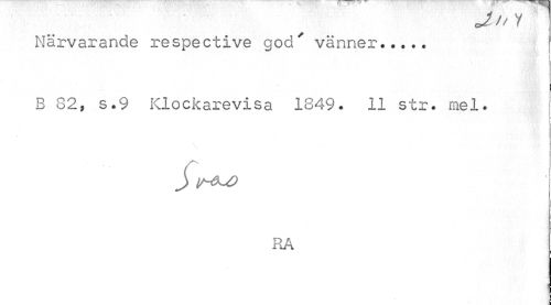 //// . * - Jn1 //// Närvarande respective god' vänner... //// B 82, s.9 Klockarevisa 1849. 11 str. mel. //// RA ////