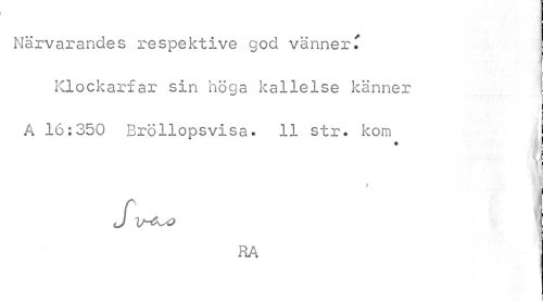 //// Närvarandes respektive god vänner T //// Klockarfar sin höga kallelse känner A 16:350 Bröllopsvisa. 11 str. kom //// ! //// t //// v //// i //// S1 //// RA ////