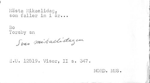 //// Nästa Mikaelidag, ' //// som faller in i år... //// Bo I //// Torsby sn 1 //// fl** ^ //// H.U. 12519. Visor, II s. 347. //// NORD. MUS. //// i ////