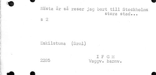 //// Nästa år så reser jag bort till Stockholms //// stora stad... //// s 2 //// » //// Eskilstuna (Srml) //// I F G H //// 2285 Vaggv. barnv. ////