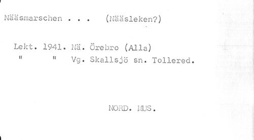 //// Nääsmarschen . . . (Nääsleken?) //// Lekt. 1941. Nä. Örebro (Alla) " Vg. Skallsjö sn. Tollered. //// NORD. MUS. ////