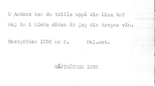 //// O Anders kan du tvifla uppå din Lina än? Nej in i bleka döden är jag din trogna vän. //// Westgöthen 1858 nr 8. Mel.not. //// % //// WÄSTGÖTHEN 1858 ////