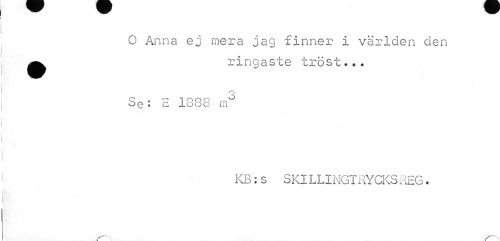 //// O Anna ej mera jag finner i världen den ^ ringaste tröst... //// O //// Se: E 1888 m //// KB: s SKILLINGTRYCKS REG. ////