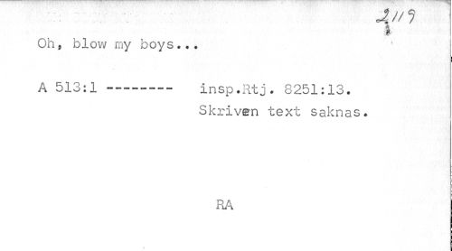 //// . v jLjn //// i //// Oh, blow my boys... • //// A 513:1 --- insp.Rtj. 8251:13. //// Skriven text saknas. //// > //// RA ////