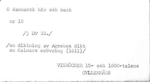 //// O danmarck hör och mark nr 18 //// /j DV 33./ //// /om diktning av Arrebos dikt om Kalmars erövring (1611)/ //// VISBÖCKER 15- och 1600-talens //// GYLLENMÄRS //// , ' _ .___Mk^___...u^.^ _...***... ////