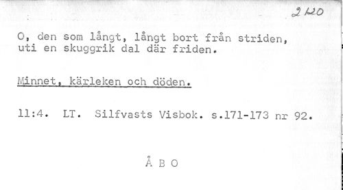 //// J uo //// » //// O, den som långt, långt bort från striden, i //// uti en skuggrik dal där friden. ! //// Minnet, kärleken och döden. //// mmmmmm*memm0**mmmt*nmmmmBamm mmmmmmmmtmmmmrnmm mrnmmmmmmmmmmmiimm rnmmmm mm... //// 11:4. LT. Silfvasts Visbok, s.171-173 nr 92. //// i //// ÅBO ////