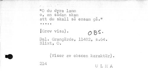 //// t ~~ - f ' r- //// * //// "O du dyra lamm //// o, en sadan skarn //// att du skall så ensam gå.n //// iGrov visa). q , //// Dal. Grangärde, 11482, s.64. Blixt, O. //// (Visor av obscen karaktär). //// 214 //// . mJm I T 7 "T ** A //// U L M A ////