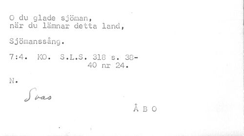 //// O du glade sjöman, //// när du lämnar detta land, //// Sjömanssång• //// • i //// 7:4. KO. S.L.S. 318 s. 38- //// 40 nr 24. //// N. //// J //// ÅBO //// <r ////