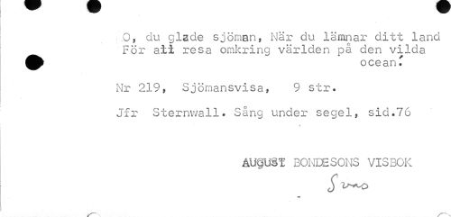 //// ;Q, du glade sjöman, När du lämnar ditt land För ati resa omkring världen på den vilda ^^ oceanT //// Nr 219, Sjömansvisa, 9 str. //// Jfr Sternwall* Sång under segel, sid.76 //// * //// ÅUöUST BONDESONS VISBOK //// ^ V-^O ////