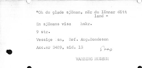 //// # //// "Oh du glade sjöman» när du lämnar ditt //// land - //// En sjömans visa hskr. 9 str. //// Vessige ¦ sn, Ref. Aug.Bondeson Acc.nr 3489, sid. 13 //// VARBERG MUSEUM ////