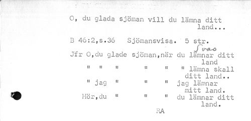 //// O, du glada sjöman vill du lämna ditt //// land... //// B 46:2,s.36 Sjömansvisa. " 5 str. //// J V^ö //// Jfr O,du glade sjöman,när du lämnar ditt //// land //// 11 tt n « 11 « lämna skall //// ditt land.. 11 jag tf 11 n jag lämnar //// mitt land. //// ^ Hör,du 11 " « du lämnar ditt //// land. //// RA ////