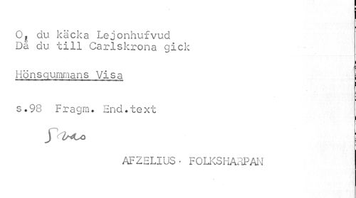 //// O, du käcka Lejonhufvud - [ //// Då du till Carlskrona gick //// ! //// I //// Hönsgummans Visa j //// s.98 Fragm. Encl.text j ^Co //// AFZELIUS • FOLKSHARPAN ////