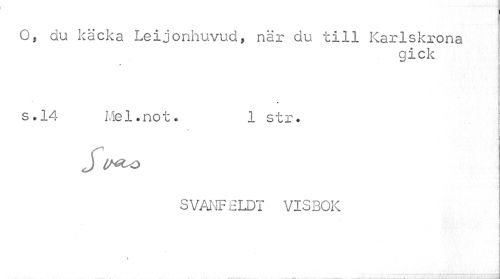 //// O, du käcka Leijonhuvud, nar du till Karlskrona //// gick //// * //// s.14 Mel.not. 1 str. //// J U^o //// SVANFELDT VISBOK ////