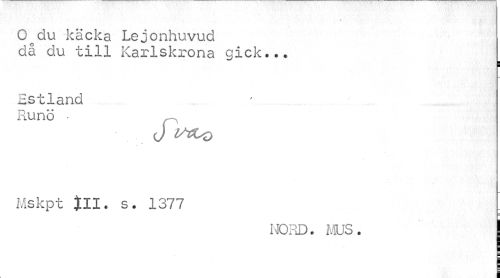 //// O du käcka Lejonhuvud //// då du till Karlskrona gick..* //// ¦ ¦ //// Estland Runö ¦ //// j ISKO //// Mskpt Jll. s. 1377 ~ //// HORD. MUS. ////