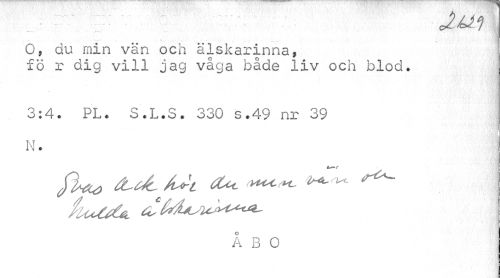 //// " ¦ ' JLtJ-l //// O, du min vän och älskarinna, //// fö r dig vill jag våga både liv och blod. //// 3:4. PL. S.L.S. 330 s.49 nr 39 N. //// fUa A^l O*. ^ ^ //// ÅBO ////