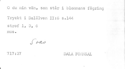//// O du min vän, som står i blommans fägring //// Tryckt i Dalälven 13:;6 s.144 //// strof 1, 3, 6 mus ? //// J //// 717:37 DALA FORNS AL //// * ////