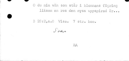 //// O du min vän som står i blommans fägrinq liksom en ros den nyss uppspirad är... //// B 28:2,s.8 Visa. 7 str. kom. //// <J //// RA ////