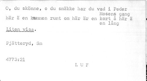 //// O i du skonne, o du smäkke har du vad i Peder //// Mosens gang //// här ä en lattamen runt om här är en kort å här ä s //// en lång //// Liten visa* //// trrni—T-inirinr i »mw» nii i tuum n //// Pjätteryd, Sm 477 3:21 //// L U F j ////