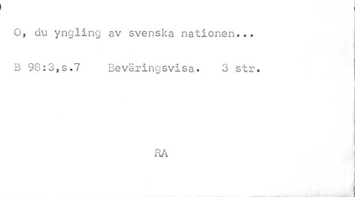 //// O, du yngling av svenska nationen... //// I //// B 98:3,s.7 Beväringsvisa• 3 str. //// i | //// RA //// .1 //// 1 //// i ////