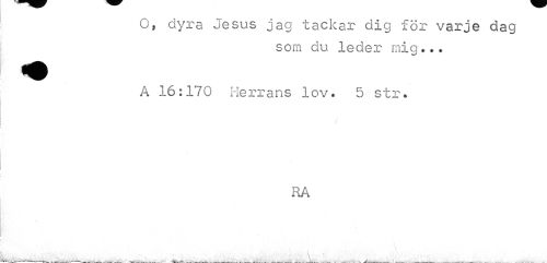//// O, dyra Jesus jag tackar dig för varje dag //// som du leder mig... //// A 16:170 Herrans lov. 5 str. //// RA //// i ////